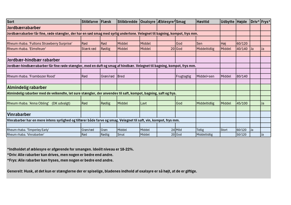 Det kan være en jungle at vælge rabarbersort. Skal det være tidlige rabarber, eller middeltidlige, så de er klar sammen med jordbærerne? Nedenfor er vores rabarbersorter listet op i skemaform, så man let kan får overblik over de forskellige egenskaber for rabarber.